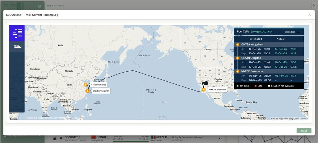 Accesa al mapa donde tendrás visibilidad en tiempo real de tus operaciones marítimas con información de los últimos 3 puertos que toca el buque así como saber si viene retrasado o en tiempo.